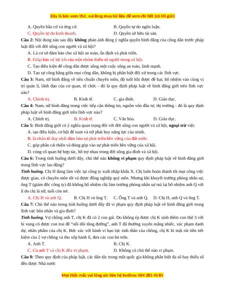 Câu 2: Nội dung nào sau đây không phản ánh đúng ý nghĩa quyền bình đẳng của công dân trước pháp