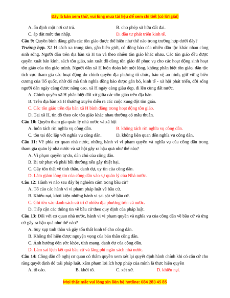 Câu 9: Quyền bình đẳng giữa các tôn giáo được thể hiện như thế nào trong trường hợp dưới đây?