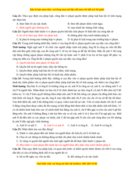 Câu 20: Chủ thể nào sau đây không vi phạm quy định pháp luật về quyền bất khả xâm phạm của công dân?