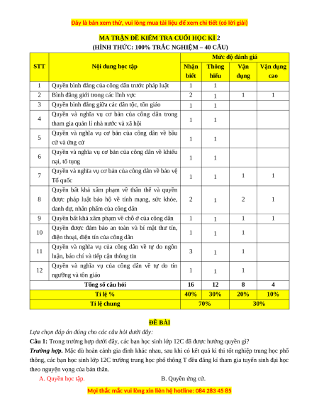Quyền và nghĩa vụ của công dân về tự do tín 12 1 1 1 ngưỡng và tôn giáo Tổng số câu hỏi 16 12 8 4 Tỉ lệ % 40% 30% 20% 10% Tỉ lệ chung 70% 30% ĐỀ BÀI