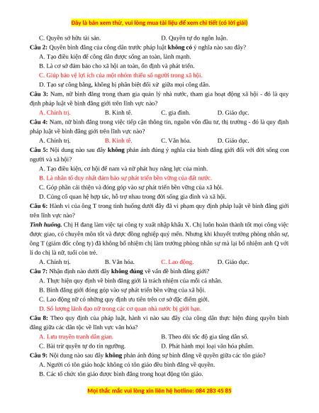 Câu 5: Nội dung nào sau đây không phản ánh đúng ý nghĩa của bình đẳng giới đối với đời sống con người và xã hội?