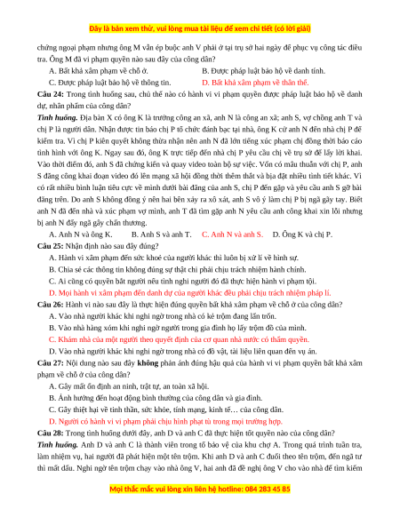 Câu 20: Chủ thể nào sau đây không vi phạm quy định pháp luật về quyền bất khả xâm phạm của công dân?