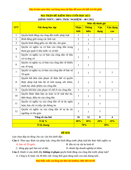 Quyền và nghĩa vụ của công dân về tự do tín 12 1 1 1 ngưỡng và tôn giáo Tổng số câu hỏi 16 12 8 4 Tỉ lệ % 40% 30% 20% 10% Tỉ lệ chung 70% 30% ĐỀ BÀI