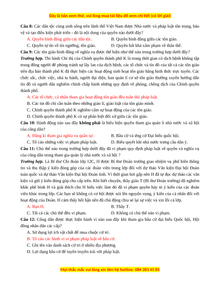 Câu 8: Các dân tộc cùng sinh sống trên lãnh thổ Việt Nam được Nhà nước và pháp luật tôn trọng, bảo