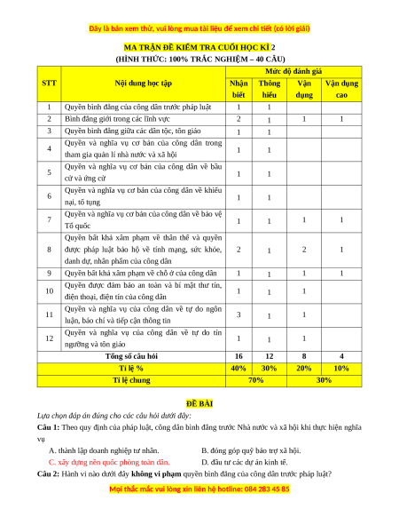 Quyền và nghĩa vụ của công dân về tự do tín 12 1 1 1 ngưỡng và tôn giáo Tổng số câu hỏi 16 12 8 4 Tỉ lệ % 40% 30% 20% 10% Tỉ lệ chung 70% 30% ĐỀ BÀI