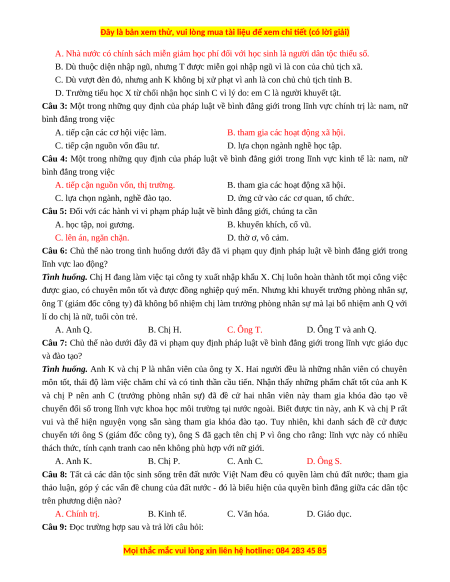 Câu 2: Hành vi nào dưới đây không vi phạm quyền bình đẳng của công dân trước pháp luật?