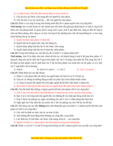 Câu 22: Nội dung nào sau đây không phản ánh đúng hậu quả của hành vi vi phạm quyền bất khả xâm