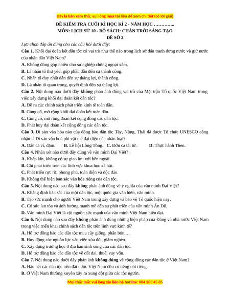 MÔN: LỊCH SỬ 10 - BỘ SÁCH: CHÂN TRỜI SÁNG TẠO ĐỀ SỐ 2