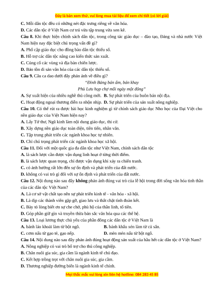 Câu 11. Đối với một quốc gia đa dân tộc như Việt Nam, chính sách dân tộc
