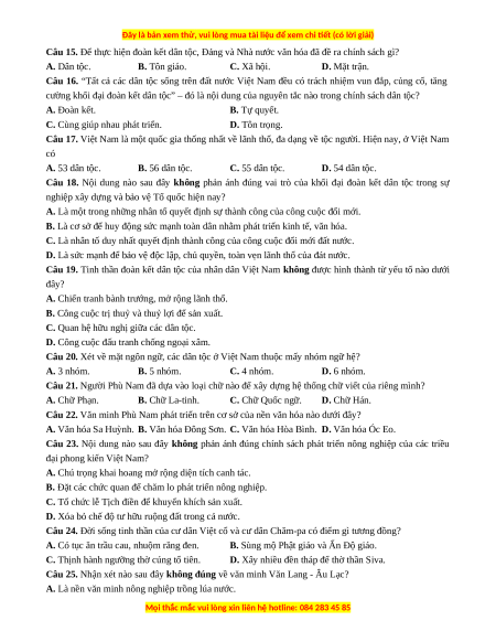Câu 15. Để thực hiện đoàn kết dân tộc, Đảng và Nhà nước văn hóa đã đề ra chính sách gì? A. Dân tộc. B. Tôn giáo. C. Xã hội. D. Mặt trận.