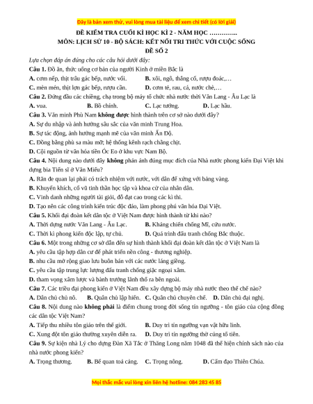 MÔN: LỊCH SỬ 10 - BỘ SÁCH: KẾT NỐI TRI THỨC VỚI CUỘC SỐNG ĐỀ SỐ 2
