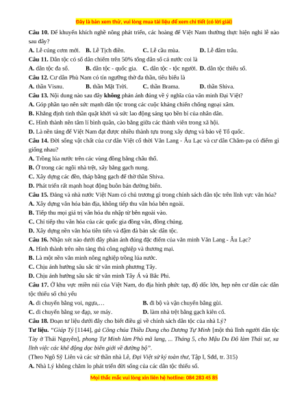 Câu 18. Đoạn tư liệu dưới đây cho biết điều gì về chính sách dân tộc của nhà Lý?