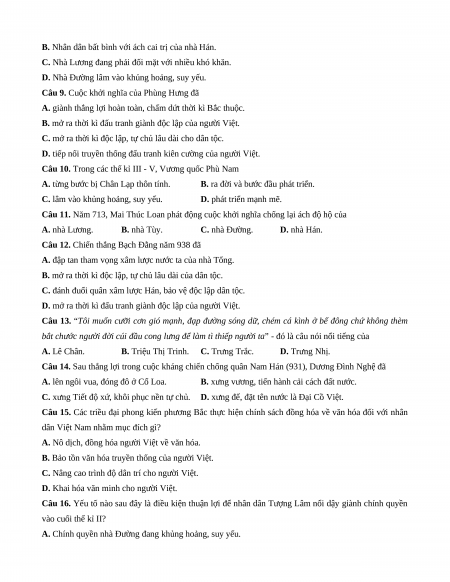 Câu 11. Năm 713, Mai Thúc Loan phát động cuộc khởi nghĩa chống lại ách độ hộ của A. nhà Lương. B. nhà Tùy. C. nhà Đường. D. nhà Hán.
