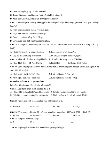 Câu 25. Nguồn gốc sinh ra thành phần khoáng trong đất là gì? A. Khí hậu. B. Địa hình. C. Sinh vật. D. Đá mẹ.