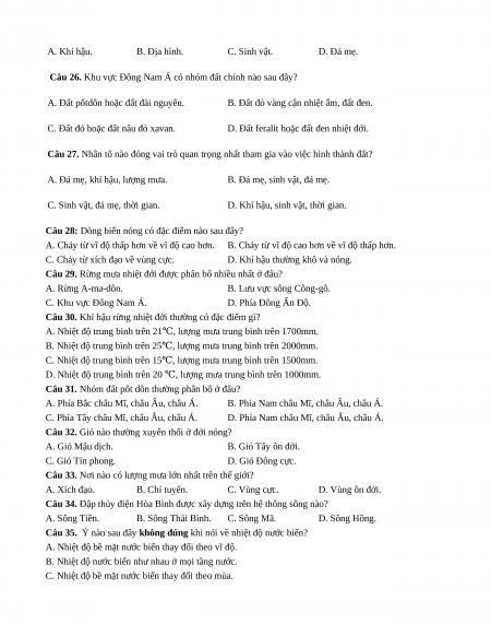 Câu 26. Khu vực Đông Nam Á có nhóm đất chính nào sau đây?