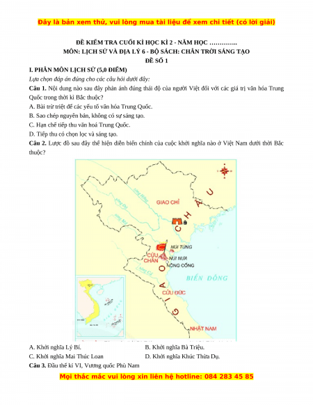 MÔN: LỊCH SỬ VÀ ĐỊA LÝ 6 - BỘ SÁCH: CHÂN TRỜI SÁNG TẠO ĐỀ SỐ 1