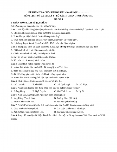 MÔN: LỊCH SỬ VÀ ĐỊA LÝ 6 - BỘ SÁCH: CHÂN TRỜI SÁNG TẠO ĐỀ SỐ 3