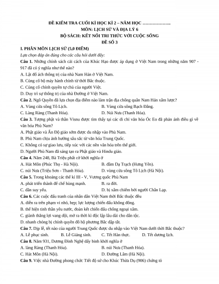 - Tailieugiaovien.com.vn giới thiệu bộ 3 đề thi cuối kì 2 (đang cập nhật) Lịch sử & Địa lý 6 Chân trời sáng tạo có lời giải chi tiết, mới nhất năm 2022 - 2023 nhằm giúp giúp Giáo viên có thêm tài liệu tham khảo ra đề thi Lịch sử & Địa lý lớp 6.