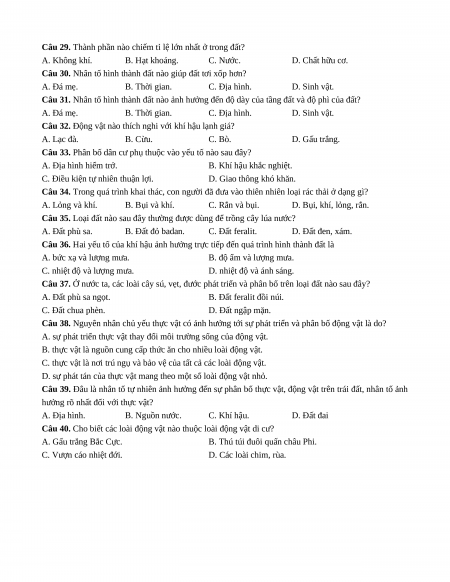 Câu 29. Thành phần nào chiếm tỉ lệ lớn nhất ở trong đất?