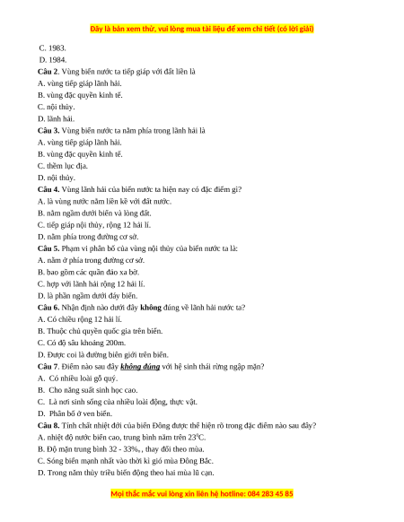 Câu 1. Luật biển quốc tế ra đời năm nào sau đây? A. 1985. B. 1982.