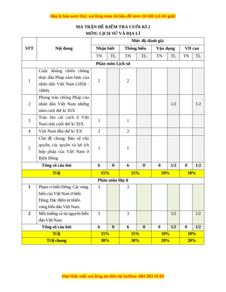 MÔN: LỊCH SỬ VÀ ĐỊA LÍ Mức độ đánh giá STT Nội dung Nhận biết Thông hiểu Vận dụng VD cao TN TL TN TL TN TL TN TL Phân môn Lịch sử Cuộc kháng chiến chống