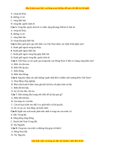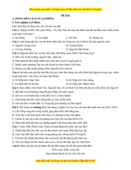 Câu 1. Tháng 9/1858, liên quân Pháp - Tây Ban Nha đã chọn địa điểm nào để mở đầu cuộc chiến tranh xâm lược Việt Nam? A. Đà Nẵng. B. Gia Định. C. Hà Nội. D. Thuận An.