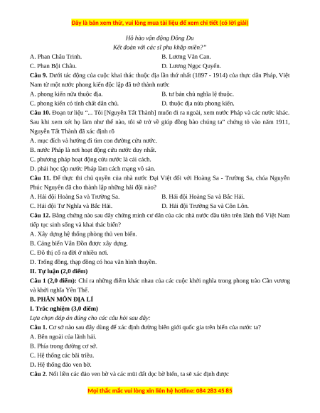 Câu 1 (2,0 điểm): Chỉ ra những điểm khác nhau của các cuộc khởi nghĩa trong phong trào Cần vương và khởi nghĩa Yên Thế. B. PHÂN MÔN ĐỊA LÍ