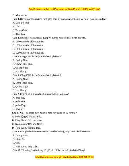 Câu 3. Điểm mốc 0 nằm trên ranh giới phía tây nam của Việt Nam và quốc gia nào sau đây? A. Cam-pu-chia. B. Lào. C. Trung Quốc. D. Thái Lan.