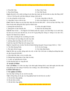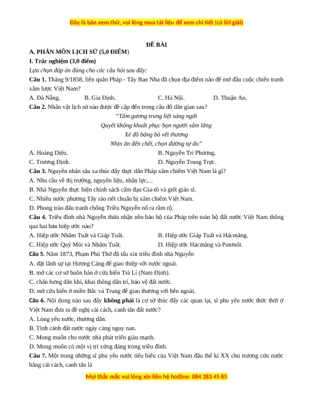 Câu 1. Tháng 9/1858, liên quân Pháp - Tây Ban Nha đã chọn địa điểm nào để mở đầu cuộc chiến tranh xâm lược Việt Nam? A. Đà Nẵng. B. Gia Định. C. Hà Nội. D. Thuận An.