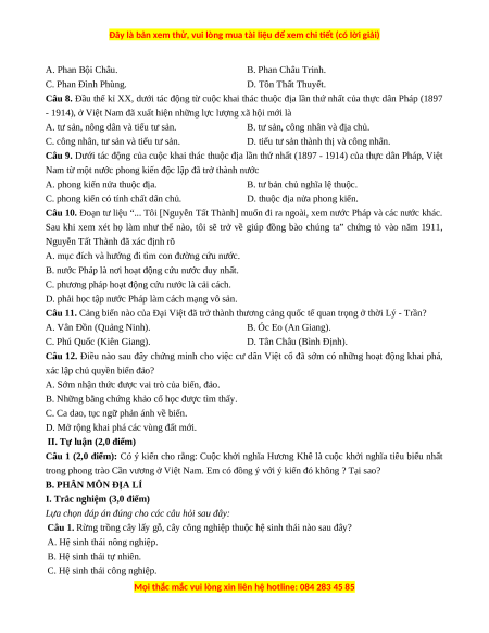 trong phong trào Cần vương ở Việt Nam. Em có đồng ý với ý kiến đó không ? Tại sao? B. PHÂN MÔN ĐỊA LÍ