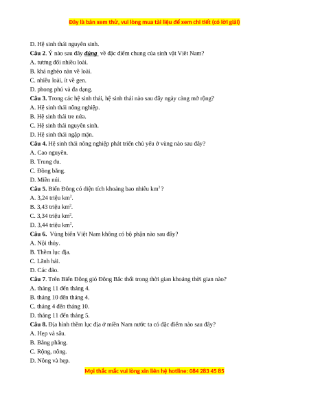 Câu 6. Vùng biển Việt Nam không có bộ phận nào sau đây? A. Nội thủy. B. Thềm lục địa. C. Lãnh hải. D. Các đảo.
