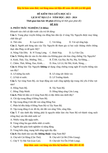 Câu 1. Trang phục truyền thống của đồng bào dân tộc ở vùng Tây Nguyên được may bằng chất liệu gì? A. Thổ cẩm. B. Lụa tơ tằm. C. Vải bông. D. Vải sợi tổng hợp.