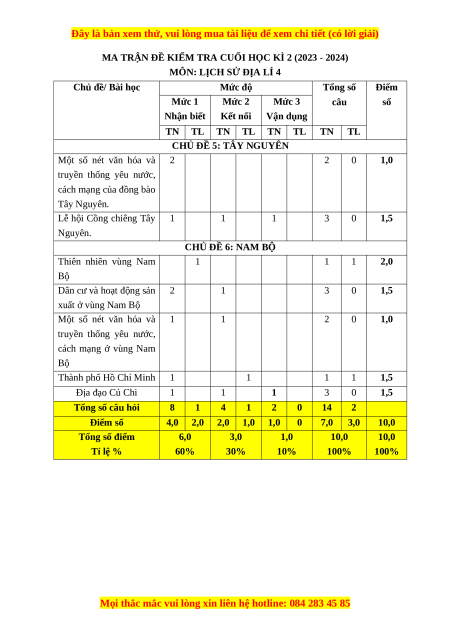 truyền thống yêu nước, cách mạng ở vùng Nam Bộ Thành phố Hồ Chí Minh 1 1 1 1 1,5 Địa đạo Củ Chi 1 1 1 3 0 1,5 Tổng số câu hỏi 8 1 4 1 2 0 14 2 Điểm số 4,0 2,0 2,0 1,0 1,0 0 7,0 3,0 10,0 Tổng số điểm 6,0 3,0 1,0 10,0 10,0 Tỉ lệ % 60% 30% 10% 100% 100%