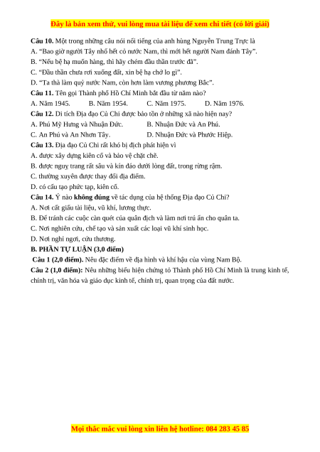 Câu 11. Tên gọi Thành phố Hồ Chí Minh bắt đầu từ năm nào? A. Năm 1945. B. Năm 1954. C. Năm 1975. D. Năm 1976.