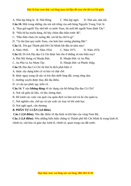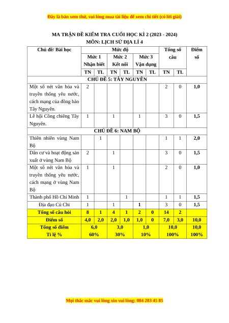 truyền thống yêu nước, cách mạng ở vùng Nam Bộ Thành phố Hồ Chí Minh 1 1 1 1 1,5 Địa đạo Củ Chi 1 1 1 3 0 1,5 Tổng số câu hỏi 8 1 4 1 2 0 14 2 Điểm số 4,0 2,0 2,0 1,0 1,0 0 7,0 3,0 10,0 Tổng số điểm 6,0 3,0 1,0 10,0 10,0 Tỉ lệ % 60% 30% 10% 100% 100%