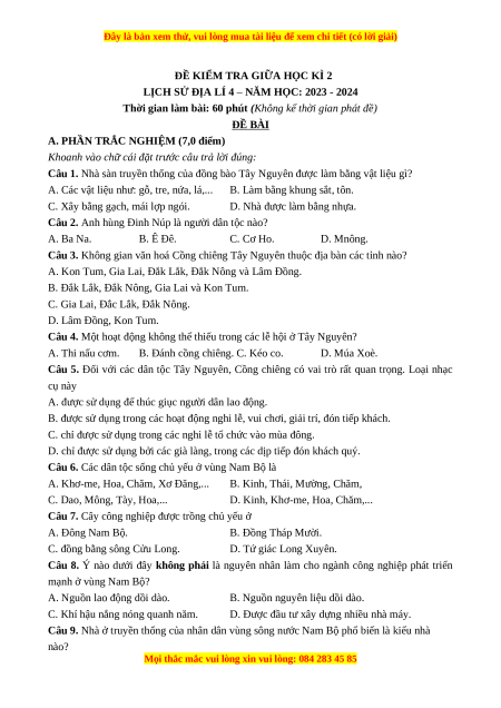 Câu 1. Nhà sàn truyền thống của đồng bào Tây Nguyên được làm bằng vật liệu gì?