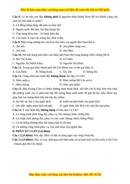 truyền thống yêu nước, cách mạng ở vùng Nam Bộ Thành phố Hồ Chí Minh 1 1 1 1 1,5 Địa đạo Củ Chi 1 1 1 3 0 1,5 Tổng số câu hỏi 8 1 4 1 2 0 14 2 Điểm số 4,0 2,0 2,0 1,0 1,0 0 7,0 3,0 10,0 Tổng số điểm 6,0 3,0 1,0 10,0 10,0 Tỉ lệ % 60% 30% 10% 100% 100%