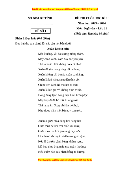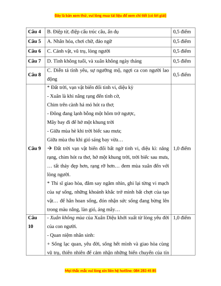 Phần I. Đọc hiểu (6,0 điểm) Câu Nội dung Điểm Câu 1 B. Mùa xuân 0,5 điểm Câu 2