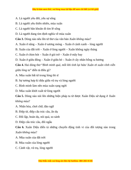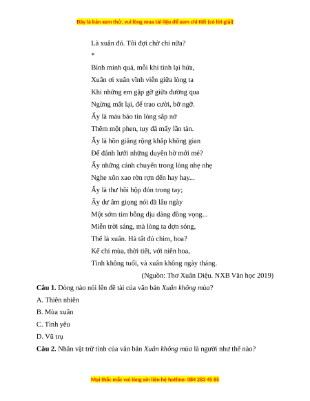 Câu 1. Dòng nào nói lên đề tài của văn bản Xuân không mùa? A. Thiên nhiên B. Mùa xuân C. Tình yêu D. Vũ trụ