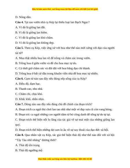 Câu 3. Nhân vật cụ Kép trong đoạn trích trên thuộc lớp người nào? A. Trí thức Tây học. B. Nhà nho cuối mùa.