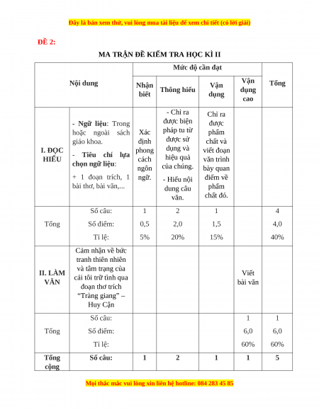 Mức độ cần đạt Nội dung Vận Tổng Nhận Vận Thông hiểu dụng biết dụng cao - Chỉ ra Chỉ ra - Ngữ liệu: Trong được biện được hoặc ngoài sách Xác pháp tu từ phẩm giáo khoa. định được sử chất và I. ĐỌC phong dụng và viết đoạn - Tiêu chí lựa HIỂU cách hiệu quả văn trình chọn ngữ liệu: ngôn của chúng. bày quan + 1 đoạn trích, 1 ngữ. - Hiểu nội điểm về bài thơ, bài văn,... dung câu phẩm văn. chất đó. Số câu: 1 2 1 4 Tổng Số điểm: 0,5 2,0 1,5 4,0 Tỉ lệ: 5% 20% 15% 40% Cảm nhận về bức tranh thiên nhiên và tâm trạng của II. LÀM Viết cái tôi trữ tình qua VĂN bài văn đoạn thơ trích “Tràng giang” – Huy Cận Số câu: 1 1 Tổng Số điểm: 6,0 6,0 Tỉ lệ: 60% 60% Tổng Số câu: 1 2 1 1 5 cộng