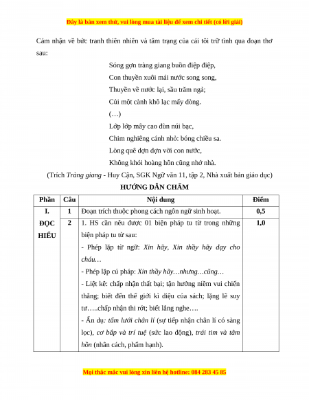 (Trích Tràng giang - Huy Cận, SGK Ngữ văn 11, tập 2, Nhà xuất bản giáo dục) HƯỚNG DẪN CHẤM Phần Câu Nội dung Điểm I. 1