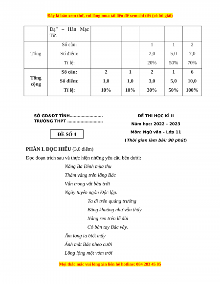 Môn: Ngữ văn – Lớp 11 ĐỀ SỐ 4
