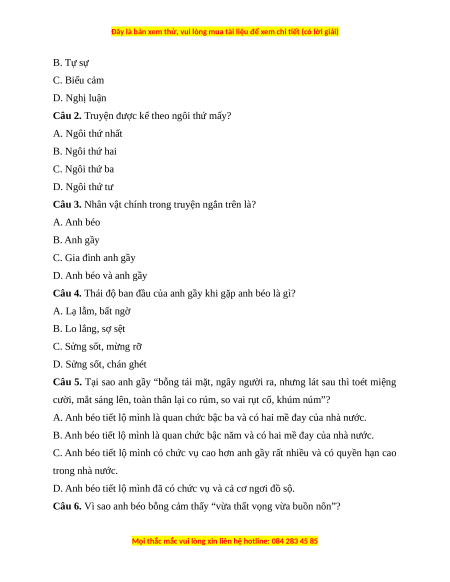Câu 1. Phương thức biểu đạt của truyện ngắn trên là? A. Miêu tả