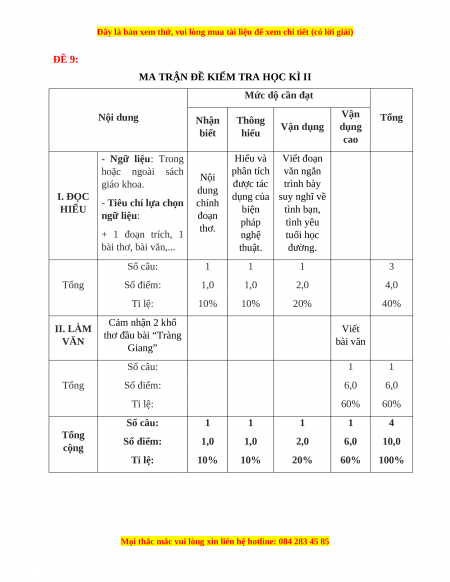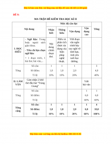 - Tiêu chí lựa chọn chính HIỂU biện tình bạn, ngữ liệu: đoạn pháp tình yêu thơ. + 1 đoạn trích, 1 nghệ tuổi học bài thơ, bài văn,... thuật. đường. Số câu: 1 1 1 3 Tổng Số điểm: 1,0 1,0 2,0 4,0 Tỉ lệ: 10% 10% 20% 40% Cảm nhận 2 khổ II. LÀM Viết thơ đầu bài “Tràng VĂN bài văn Giang” Số câu: 1 1 Tổng Số điểm: 6,0 6,0 Tỉ lệ: 60% 60% Số câu: 1 1 1 1 4 Tổng Số điểm: 1,0 1,0 2,0 6,0 10,0 cộng Tỉ lệ: 10% 10% 20% 60% 100%