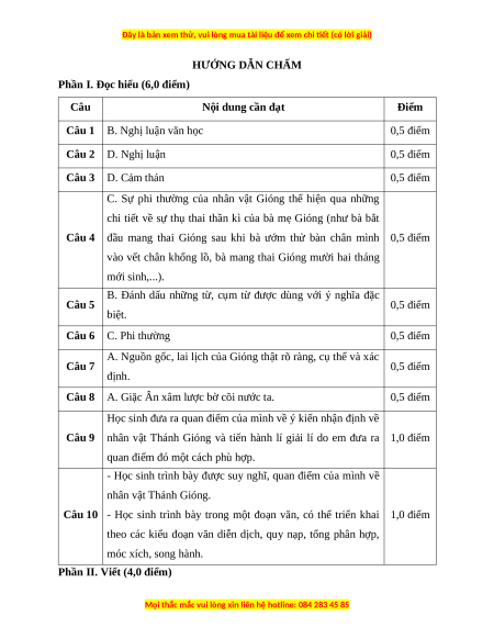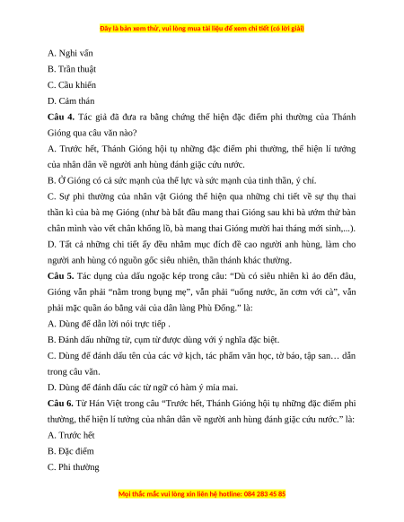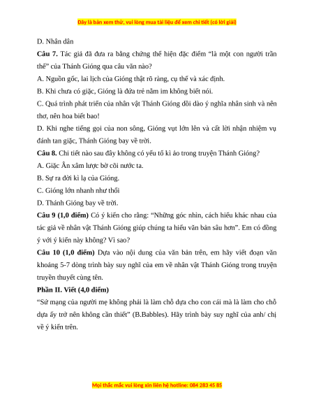 Câu 8. Chi tiết nào sau đây không có yếu tố kì ảo trong truyện Thánh Gióng?