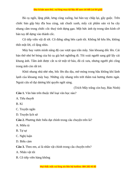 Câu 1. Văn bản trên thuộc thể loại văn học nào? A. Tiểu thuyết B. Kí C. Truyện ngắn D. Truyện lịch sử