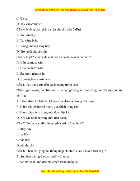 Câu 4. Không gian diễn ra câu chuyện trên ở đâu? A. Tại sân bay B. Tại cảng biển C. Trong khoang máy bay D. Trên một chuyến tàu