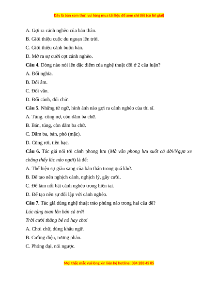 A. Gợi ra cảnh nghèo của bản thân. 0,5 điểm Câu 4 A. Đối nghĩa. 0,5 điểm Câu 5