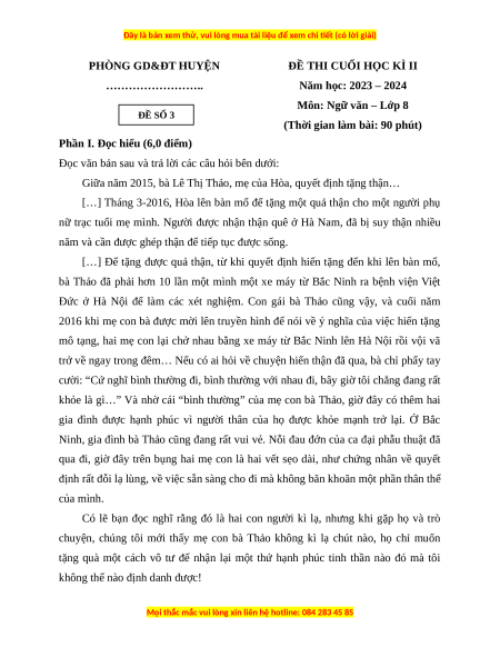 Môn: Ngữ văn – Lớp 8 ĐỀ SỐ 3